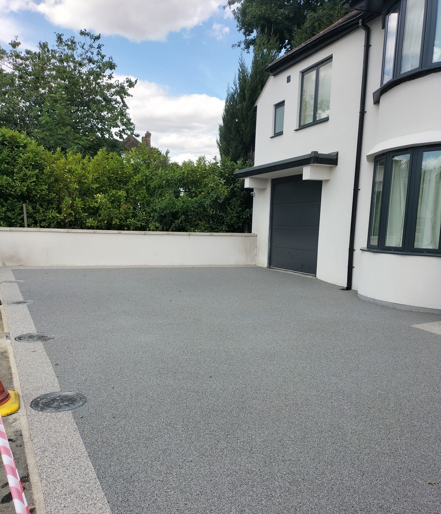 This modern grey resin-bound driveway in Hertfordshire brings a sleek, contemporary finish to the property’s exterior. The light grey surface pairs perfectly with the home’s white render and black-framed windows, offering a clean, minimalist aesthetic. Carefully installed flush utility covers are colour-matched to blend seamlessly into the surface, while silver granite-style edging provides crisp definition and enhances kerb appeal. The result is a flawless, non-slip finish that connects the pavement to the entrance with both style and practicality.