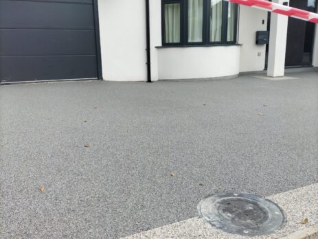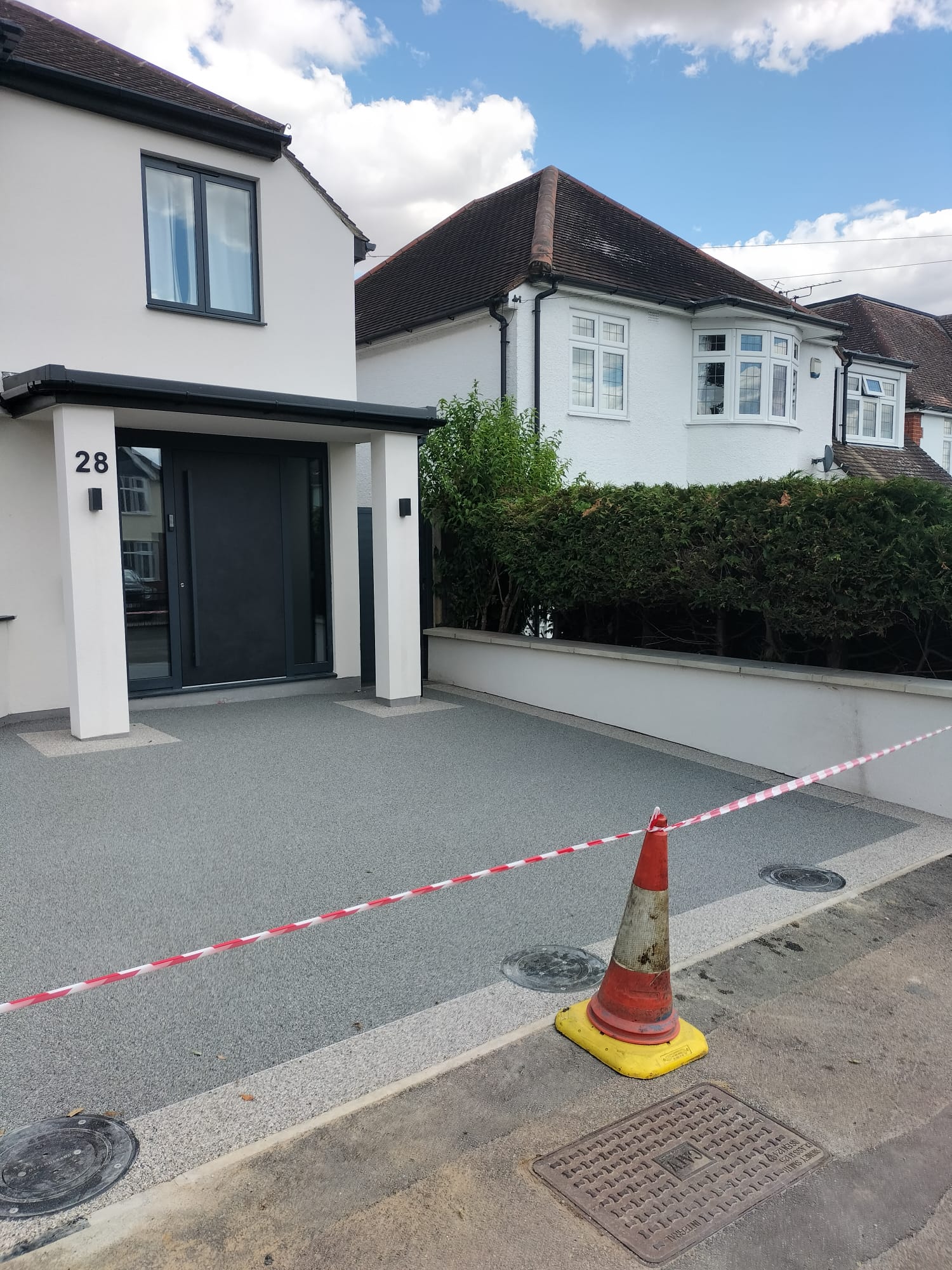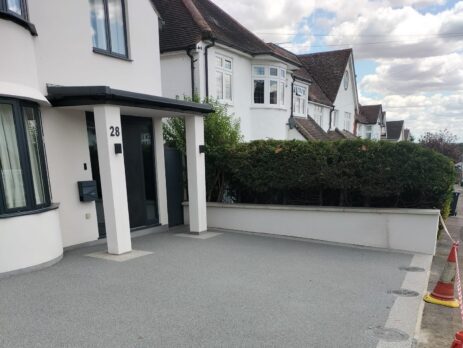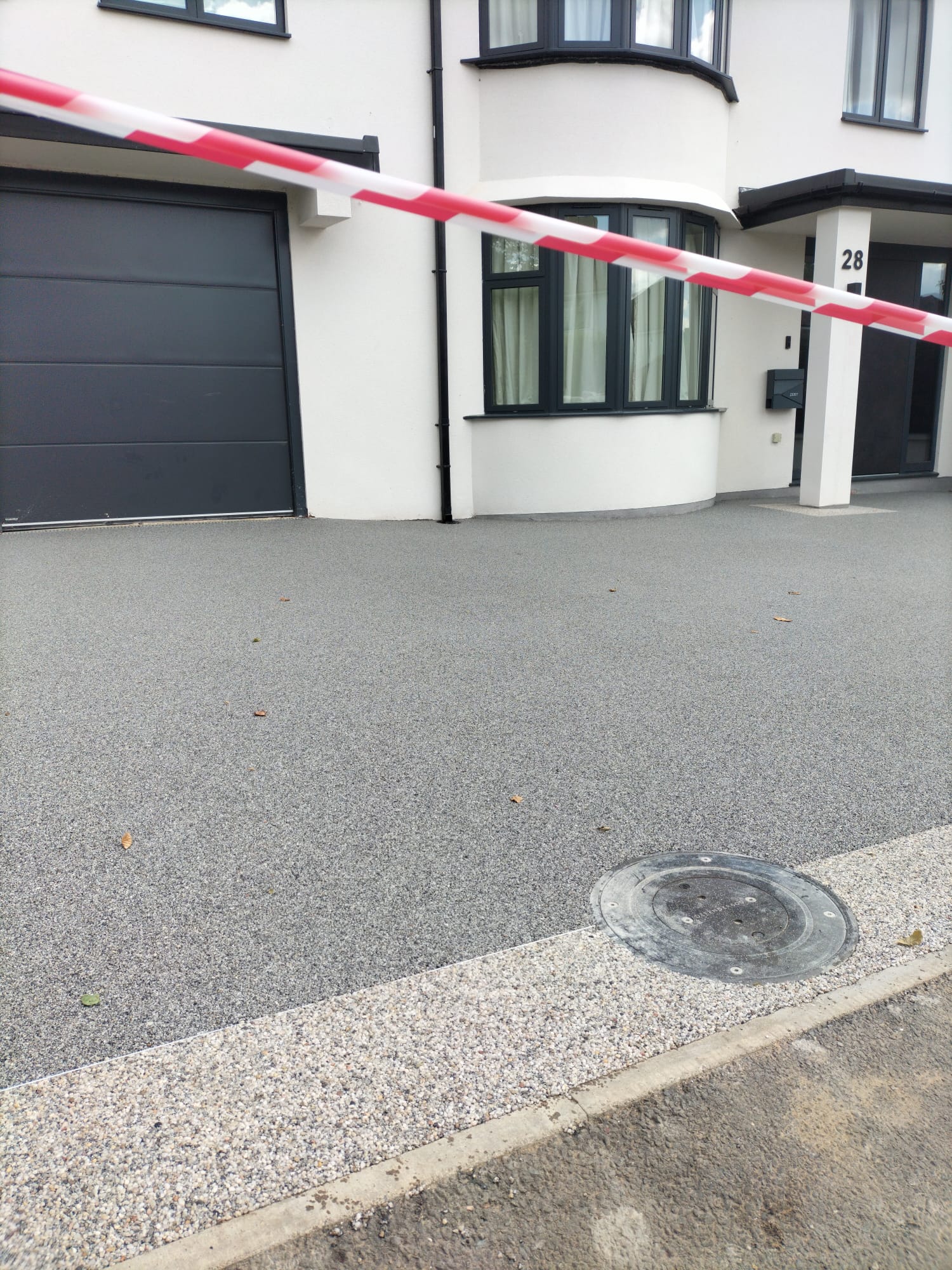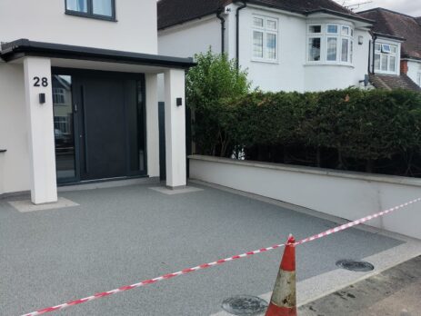 This modern grey resin-bound driveway in Hertfordshire brings a sleek, contemporary finish to the property’s exterior. The light grey surface pairs perfectly with the home’s white render and black-framed windows, offering a clean, minimalist aesthetic. Carefully installed flush utility covers are colour-matched to blend seamlessly into the surface, while silver granite-style edging provides crisp definition and enhances kerb appeal. The result is a flawless, non-slip finish that connects the pavement to the entrance with both style and practicality.