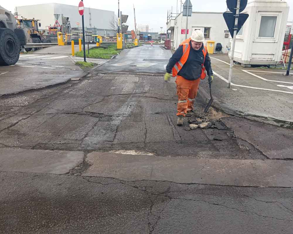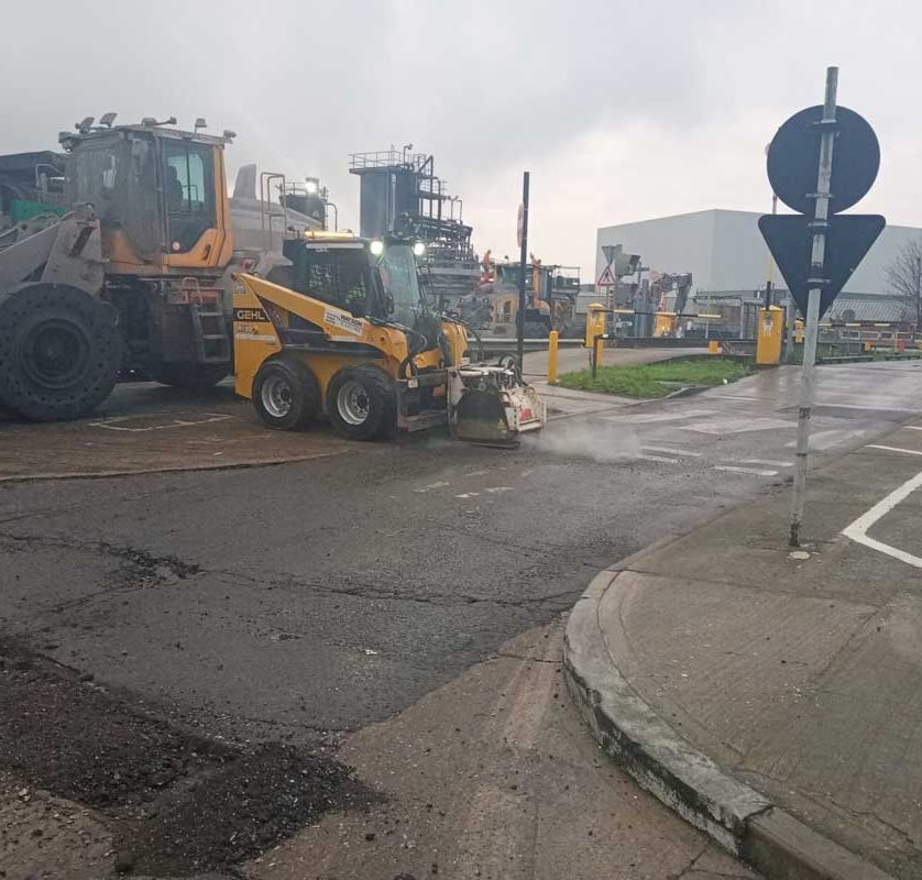 This project documents a comprehensive industrial road repair and resurfacing scheme carried out within a live operational site. The images show the controlled removal of failed asphalt using specialist plant, allowing deteriorated sections to be fully broken out and prepared for reinstatement. Care was taken to manage site access and vehicle movements throughout, ensuring the works progressed safely without disrupting surrounding operations.