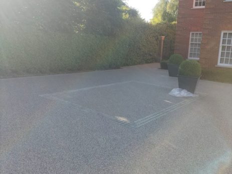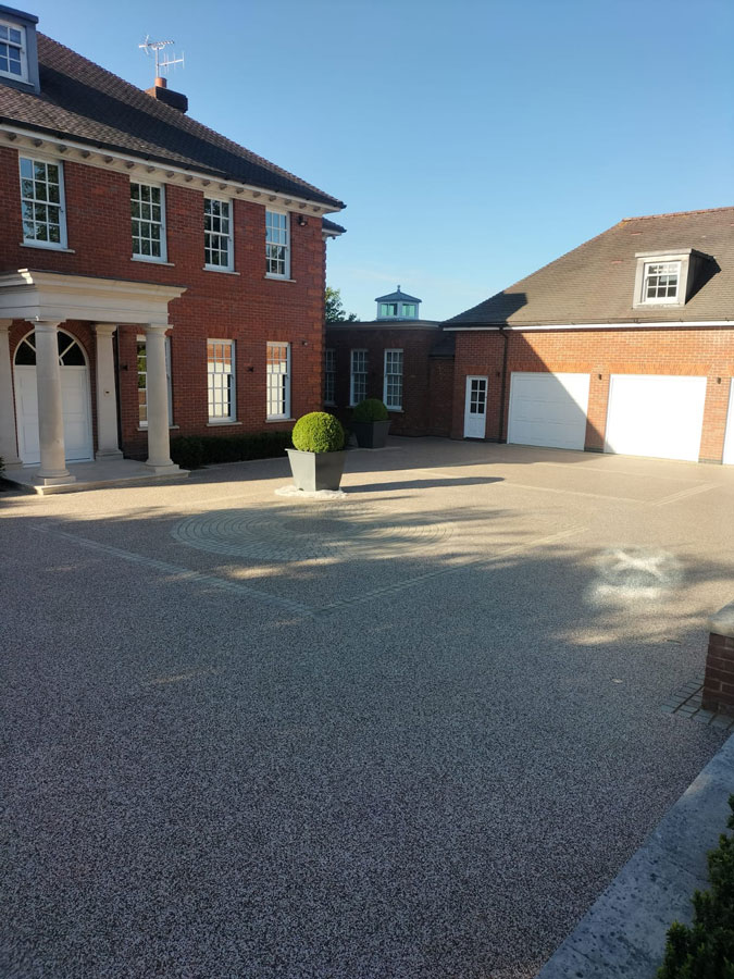 This stunning driveway transformation showcases a beautifully finished resin-bound surface designed to complement the elegance of this modern home. The light aggregate blend provides a clean, refined look that enhances the property’s curb appeal while offering long-lasting durability and low maintenance. The subtle circular and bordered patterns add a touch of sophistication, creating a functional yet decorative space that perfectly suits the home’s classic architecture.